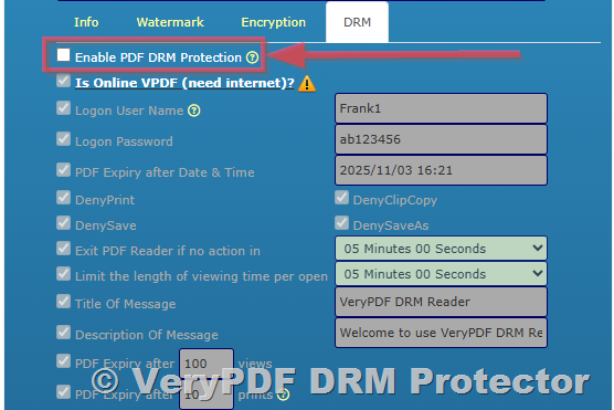 - Enable “PDF DRM Protection.”