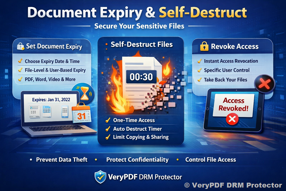 In today’s digital world, sharing documents is inevitable, but so is the risk of sensitive information falling into the wrong hands. Whether it’s confidential company data, training materials, or personal records, controlling access to your files is critical. That’s where VeryPDF DRM Protector steps in with its Document Expiry and Self-Destruct features, giving you full control over who sees your documents, for how long, and under what conditions.