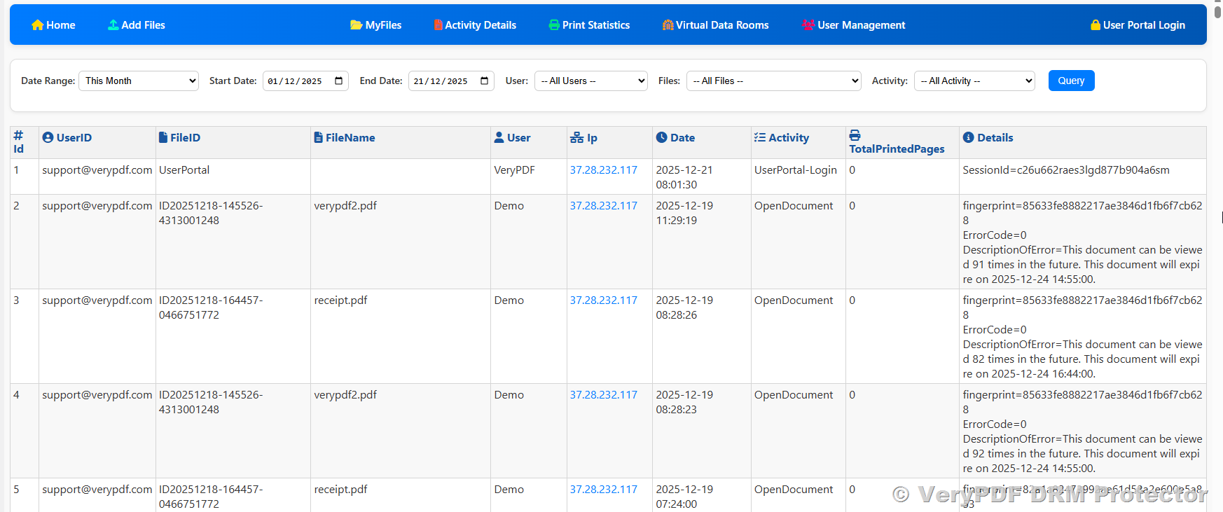 Even with DRM, it’s important to track who reads your books. VeryPDF DRM provides detailed user activity logs: