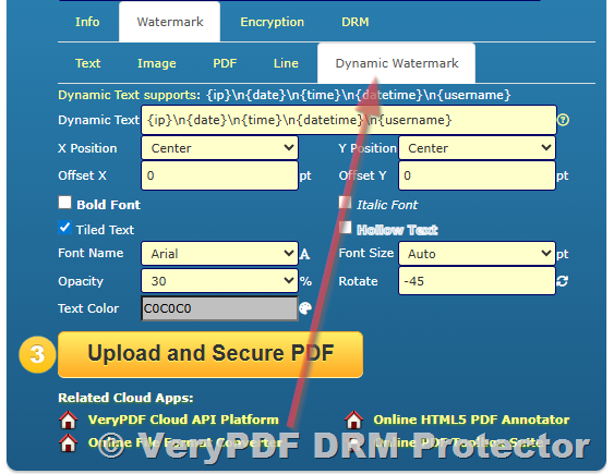 Dynamic Watermarking is a powerful feature of VeryPDF DRM. It allows you to add visible, user-specific information to your PDFs, such as: