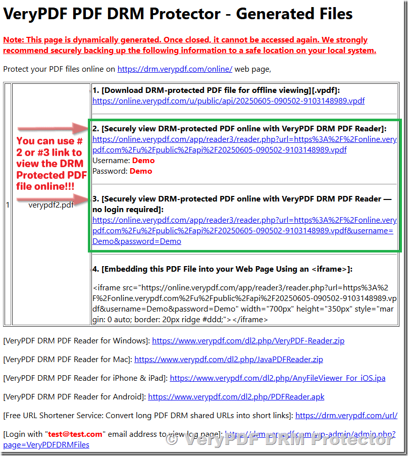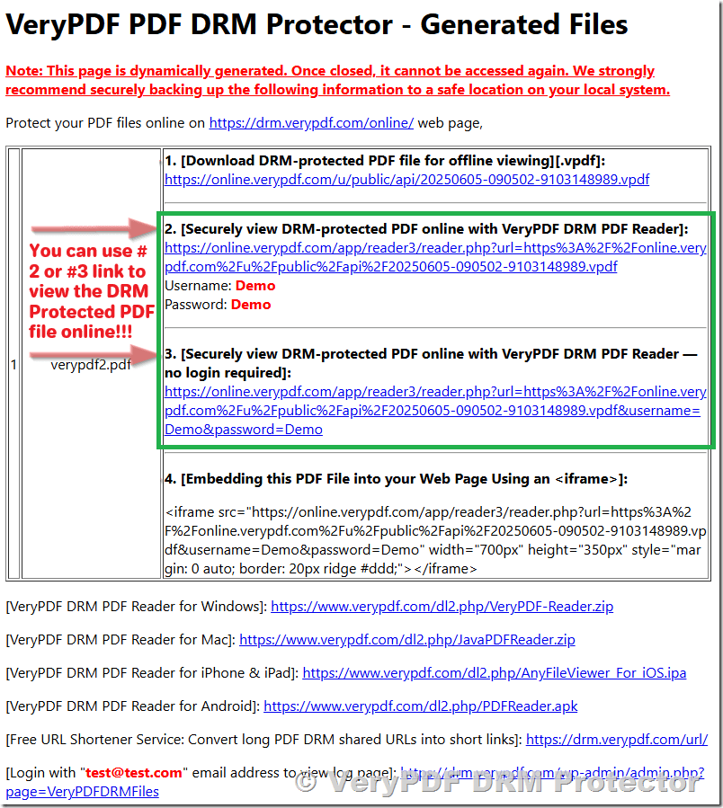 Use the second or third output links to view or share protected PDFs online without downloads.