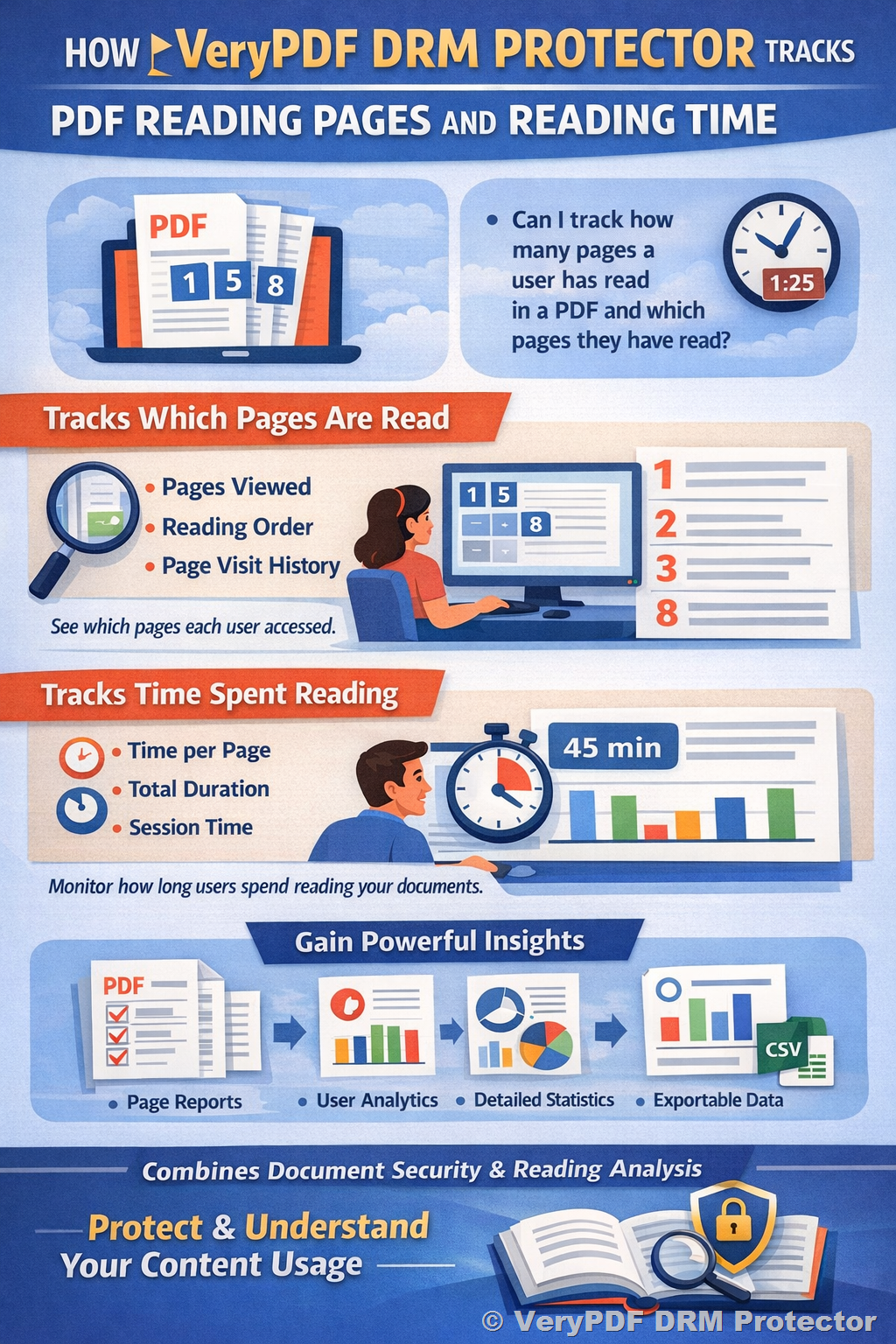 With VeryPDF DRM Protector, the answer to both questions is yes. The platform already provides built-in, production-ready functionality to track page-level reading activity and reading time, giving content owners deep insight into real user engagement.