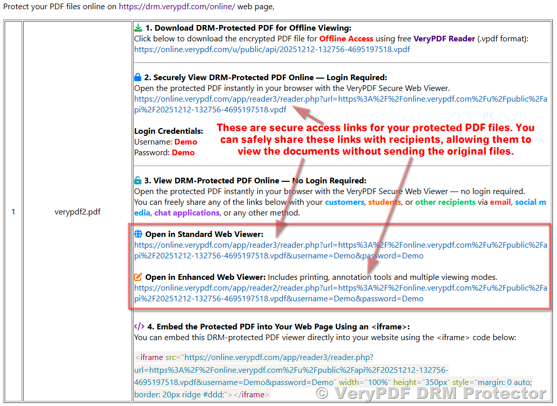With VeryPDF DRM Protector, PDF files can be uploaded manually through the web interface, automatically through PHP or REST API integration, or assigned through structured Virtual Data Rooms via the user portal. Each upload method supports the full range of DRM features, including static and dynamic watermarks, print/view restrictions, expiration controls, online tracking, and direct integration with user accounts. After protection, PDF files can be shared by downloading the encrypted .vpdf package, distributing secure-view URLs, or allowing end-users to access files through a dedicated login portal.