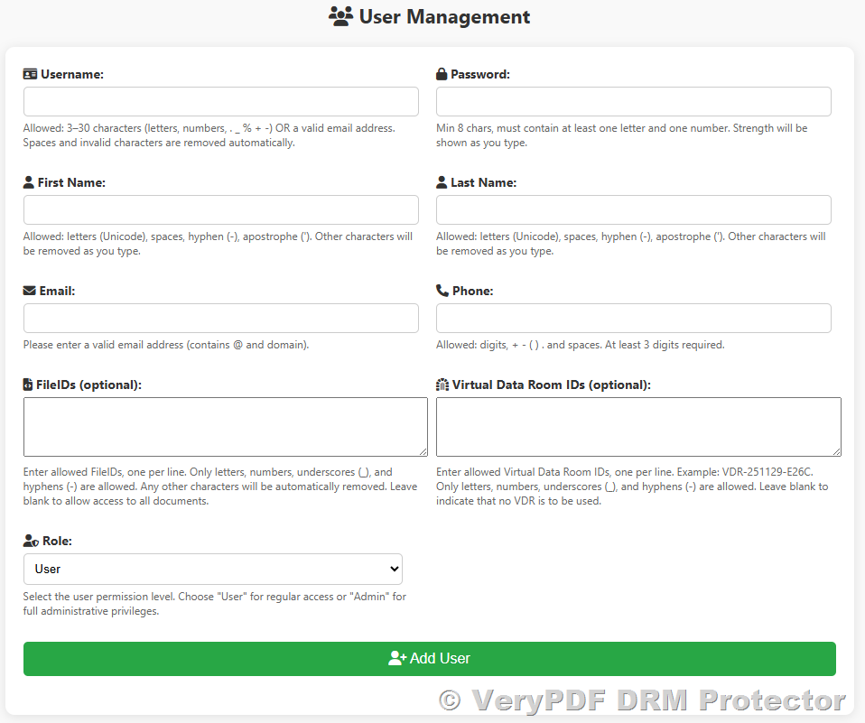 To efficiently manage large numbers of users, VeryPDF DRM Protector supports CSV-based bulk import. Your CSV file should contain the following columns: