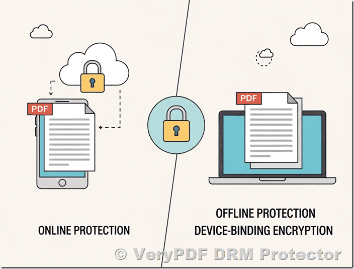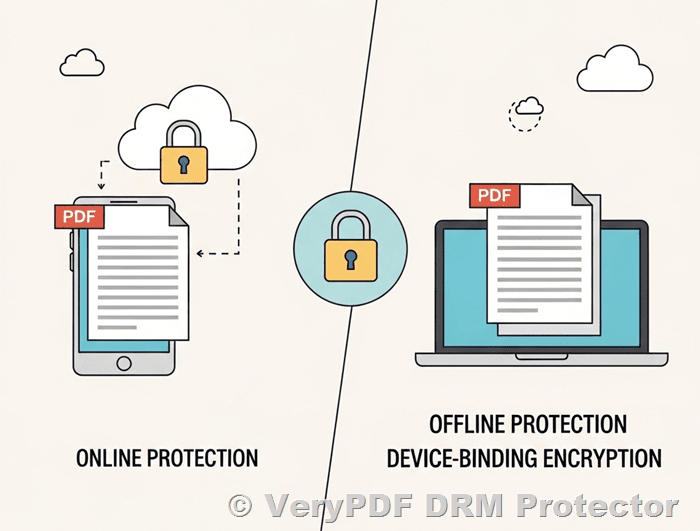 In today’s digital landscape, protecting PDF documents from unauthorized access and distribution is crucial for content creators and businesses. Two primary approaches exist for PDF protection: online PDF protection and offline PDF protection with Digital Rights Management (DRM). This article provides a detailed comparison of these two solutions, with particular focus on an offline protection method that uses device-specific encryption.
