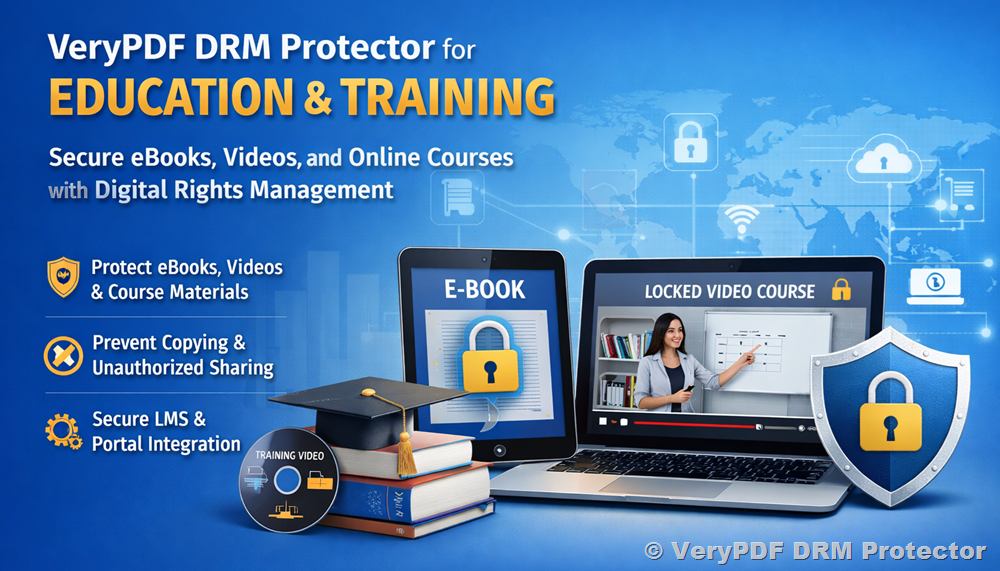 This is where VeryPDF DRM Protector comes in — a robust digital rights management (DRM) solution designed specifically for the education and training industry. VeryPDF DRM Protector enables educational institutions to protect eBooks, videos, course materials, and other digital assets while maintaining full control over how users access and interact with the content.