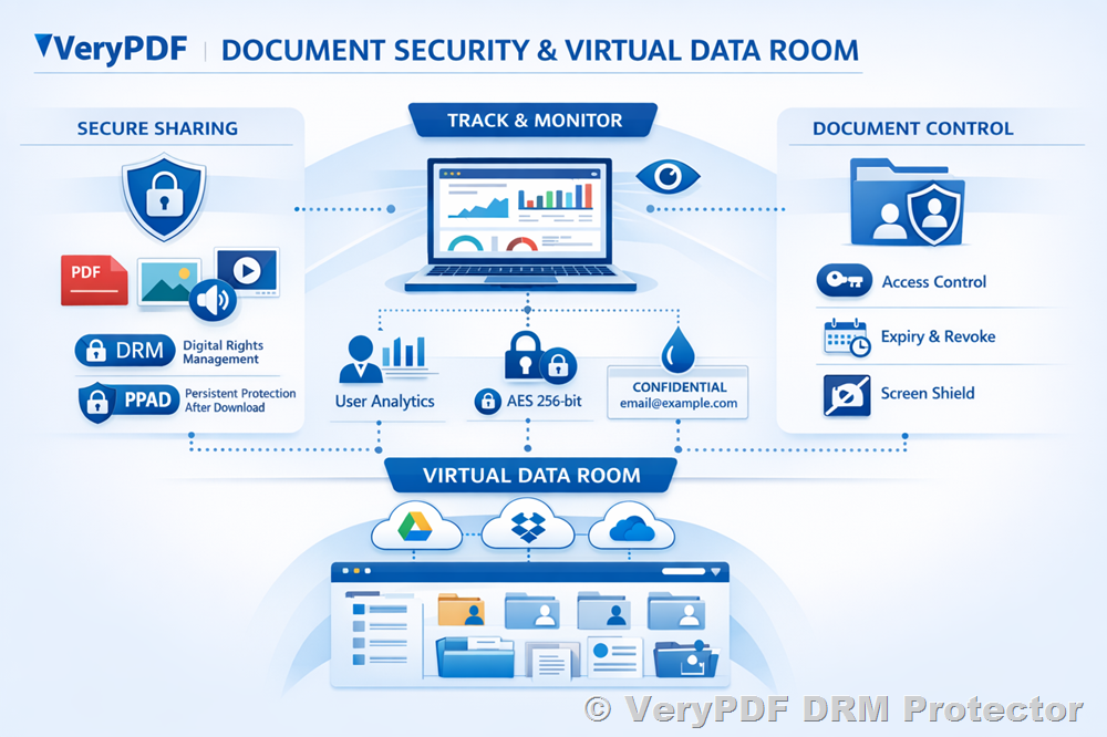 In today’s digital age, protecting your valuable documents, media, and intellectual property is more critical than ever. VeryPDF Document Security & Virtual Data Room (VDR) provides a secure, simple, and comprehensive solution to safeguard, manage, and monitor your confidential files. Whether you’re sharing PDFs, images, videos, or business reports, VeryPDF DRM Protector ensures your content remains under your control at all times.