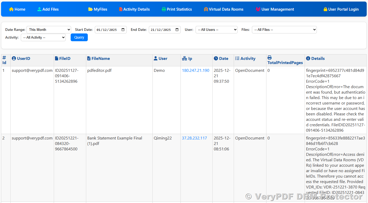 VeryPDF DRM Protector Enterprise User Manual -- Comprehensive Guide to PDF Protection, User Management, Access Control, Activity Auditing, Virtual Data Rooms, and Secure Batch PDF Protection