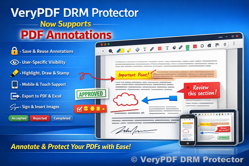 We are excited to announce that VeryPDF DRM Protector now supports PDF Annotations, adding a powerful new layer of interactivity and productivity for protected PDF and EPUB documents. With this feature, users can highlight, comment, draw, stamp, and more, all while keeping documents secure and DRM-protected. Whether you are a teacher, student, researcher, or business professional, PDF Annotations take your workflow to the next level.